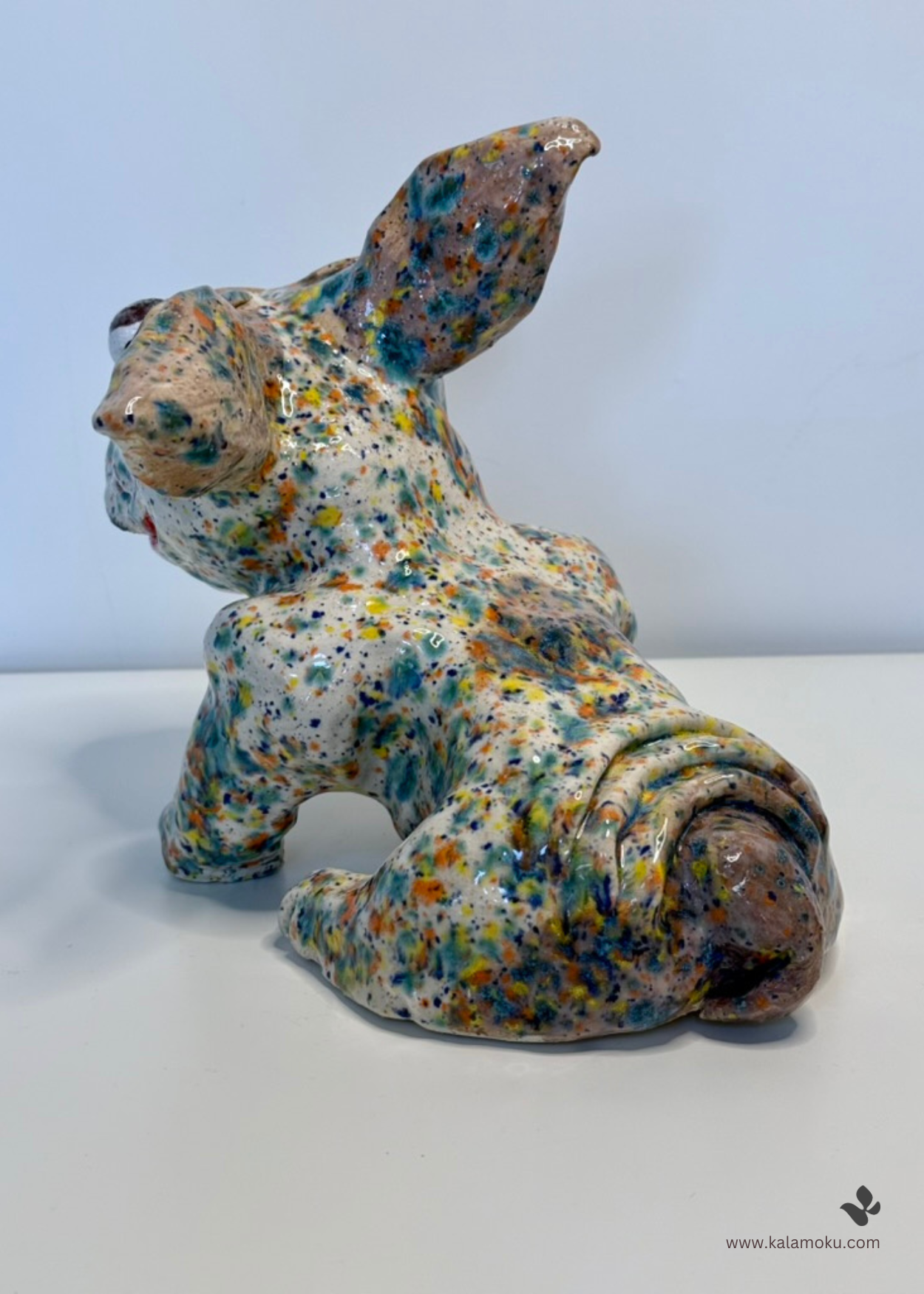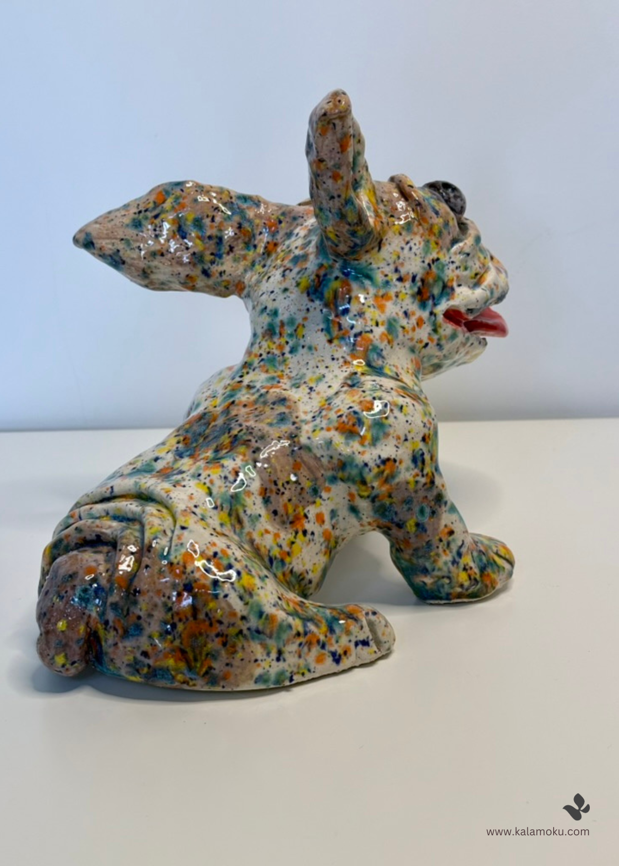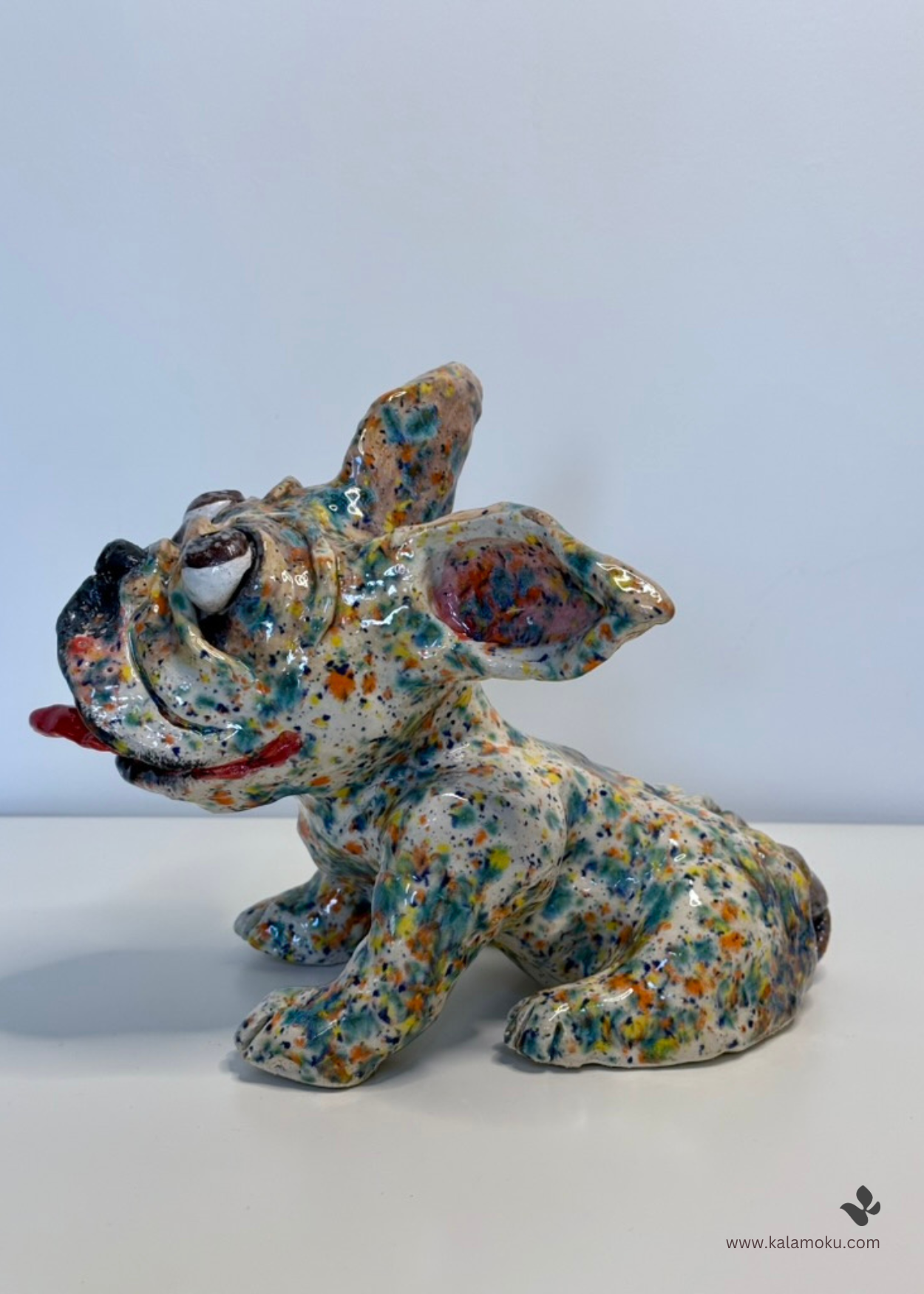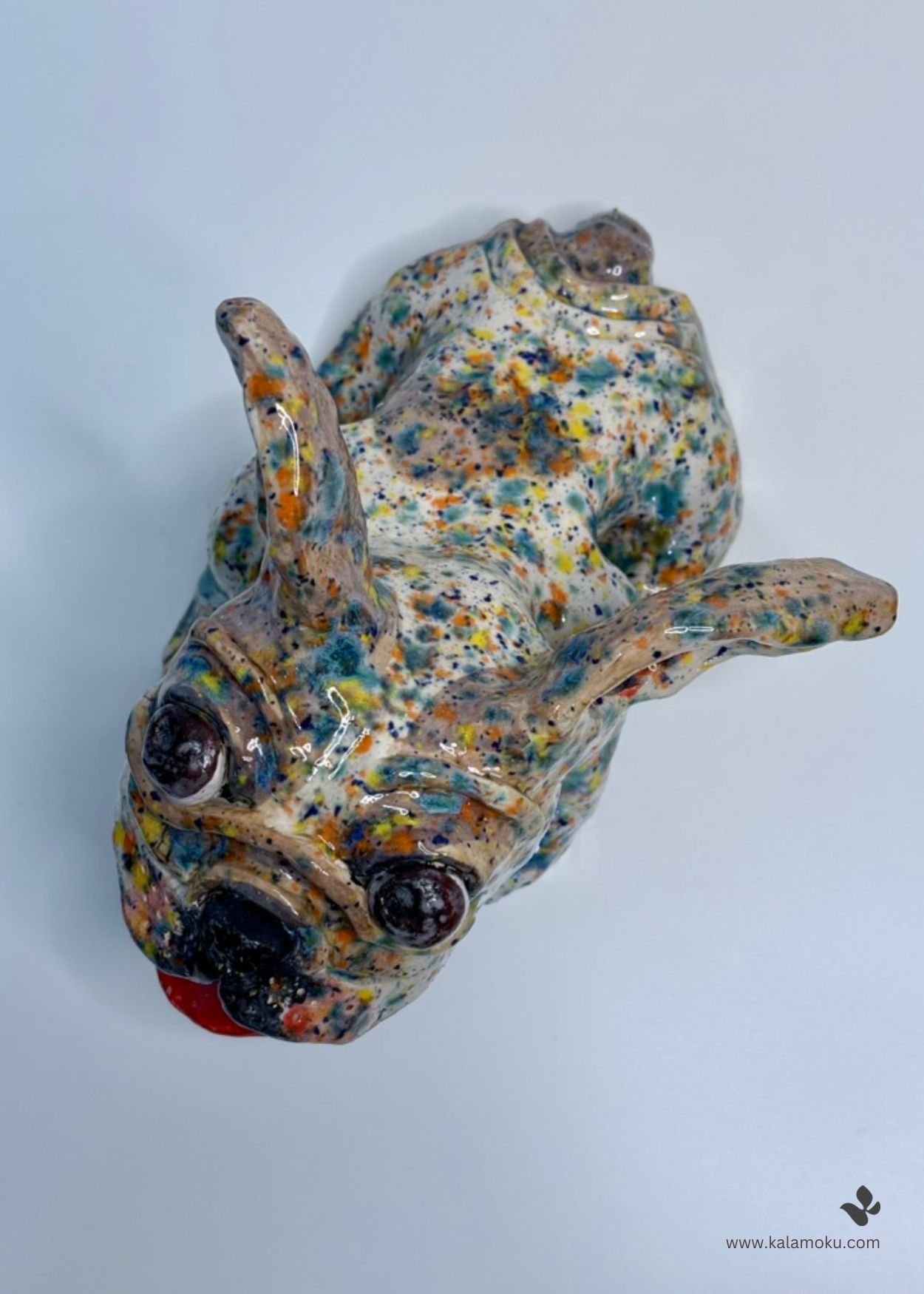 Your sculpture will be made from stoneware clay and hand built. Once dried it will be fired at 995 degrees C before the decoration is applied. I’ll then add details like markings in underglaze before the final gloss glaze is chosen to match your dog’s personality. For example, bright fruity freckles to indicate a playful nature.